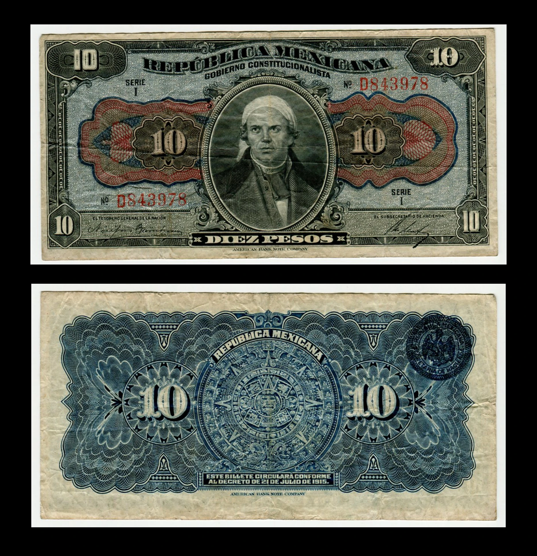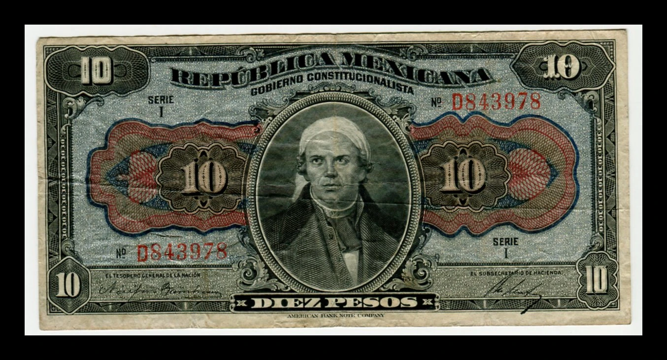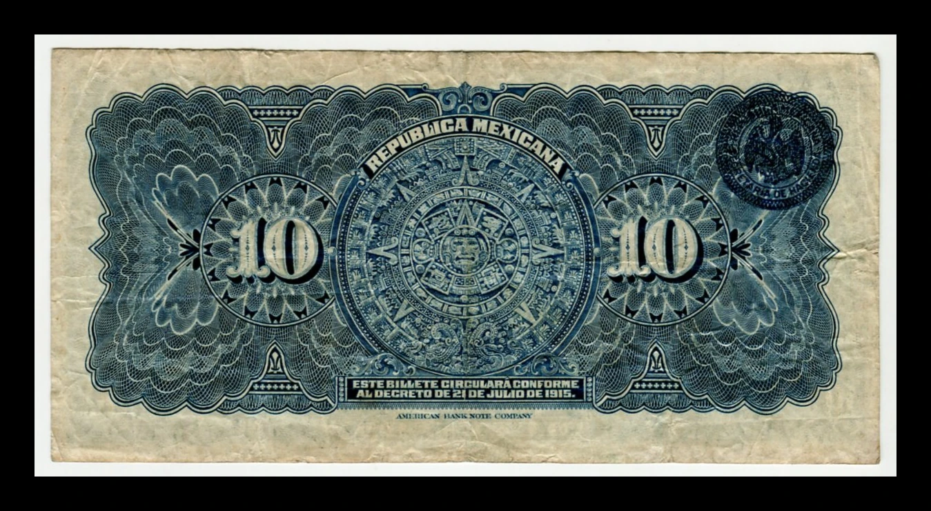 Billete antiguo de 10 pesos emitido en 1915 por el Gobierno Constitucionalista de la República Mexicana, con el retrato de José María Morelos y Pavón al centro. Impreso por la American Bank Note Company, presenta un diseño detallado en tonos verdes, rojos y negros en el anverso, y un elaborado patrón en azul con la Piedra del Sol en el reverso. Este ejemplar muestra desgaste propio de circulación, con dobleces visibles y ligera pátina, manteniendo aún buena legibilidad y atractivo visual. Es una pieza histórica representativa de la Revolución Mexicana, ideal para coleccionistas de numismática y billetes antiguos.
