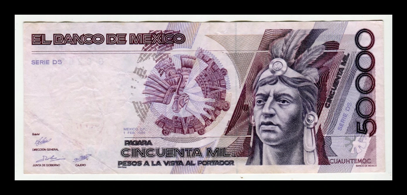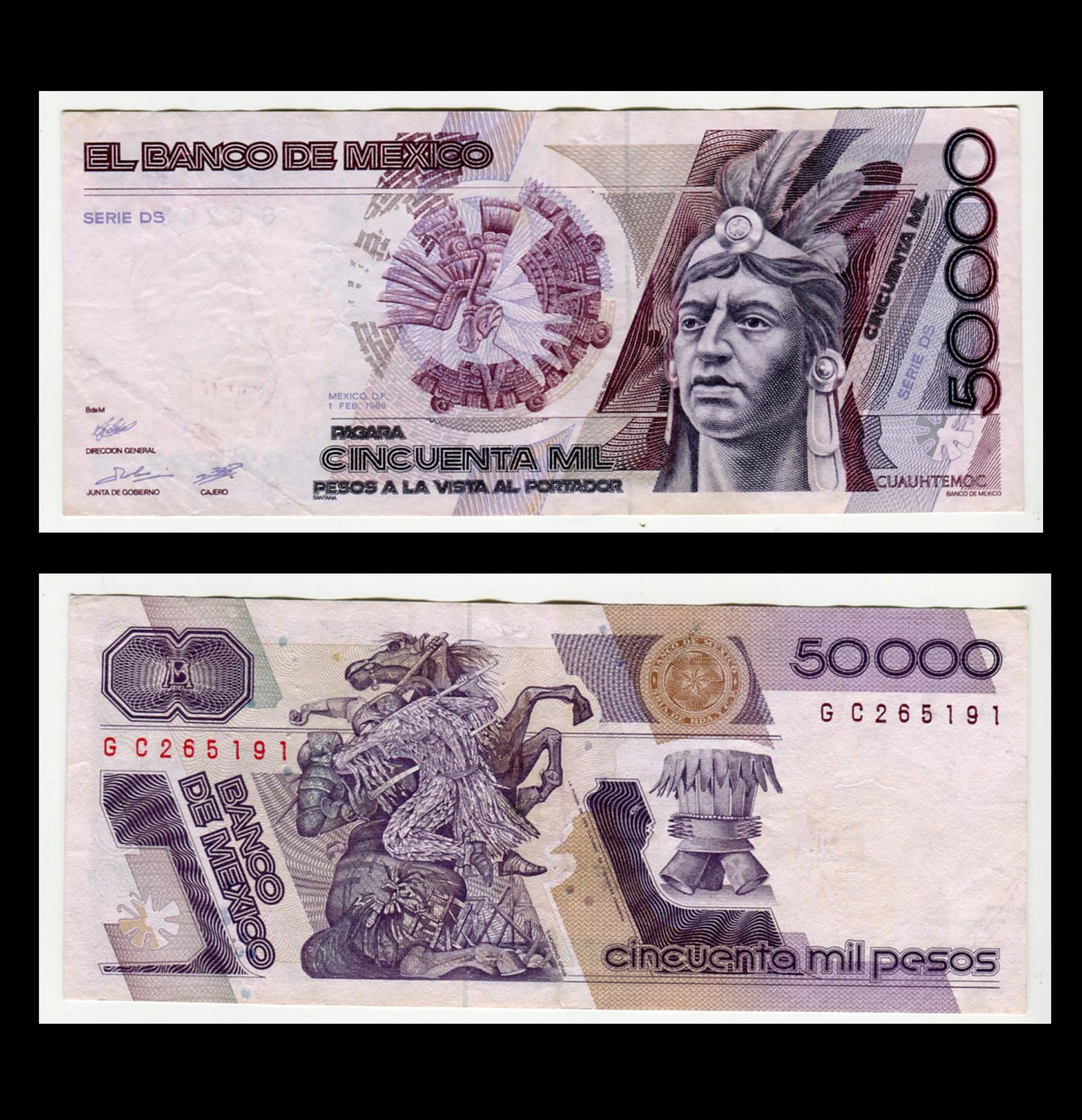 Billete antiguo de 50,000 pesos mexicanos emitido por el Banco de México en 1988, correspondiente a la serie DS. En el anverso destaca el retrato de Cuauhtémoc, último tlatoani mexica, acompañado de elementos gráficos prehispánicos y patrones geométricos en tonalidades moradas. La denominación “50000” se presenta de forma vertical, junto con detalles finos de impresión que reflejan el diseño característico del papel moneda mexicano previo a la reconversión monetaria.