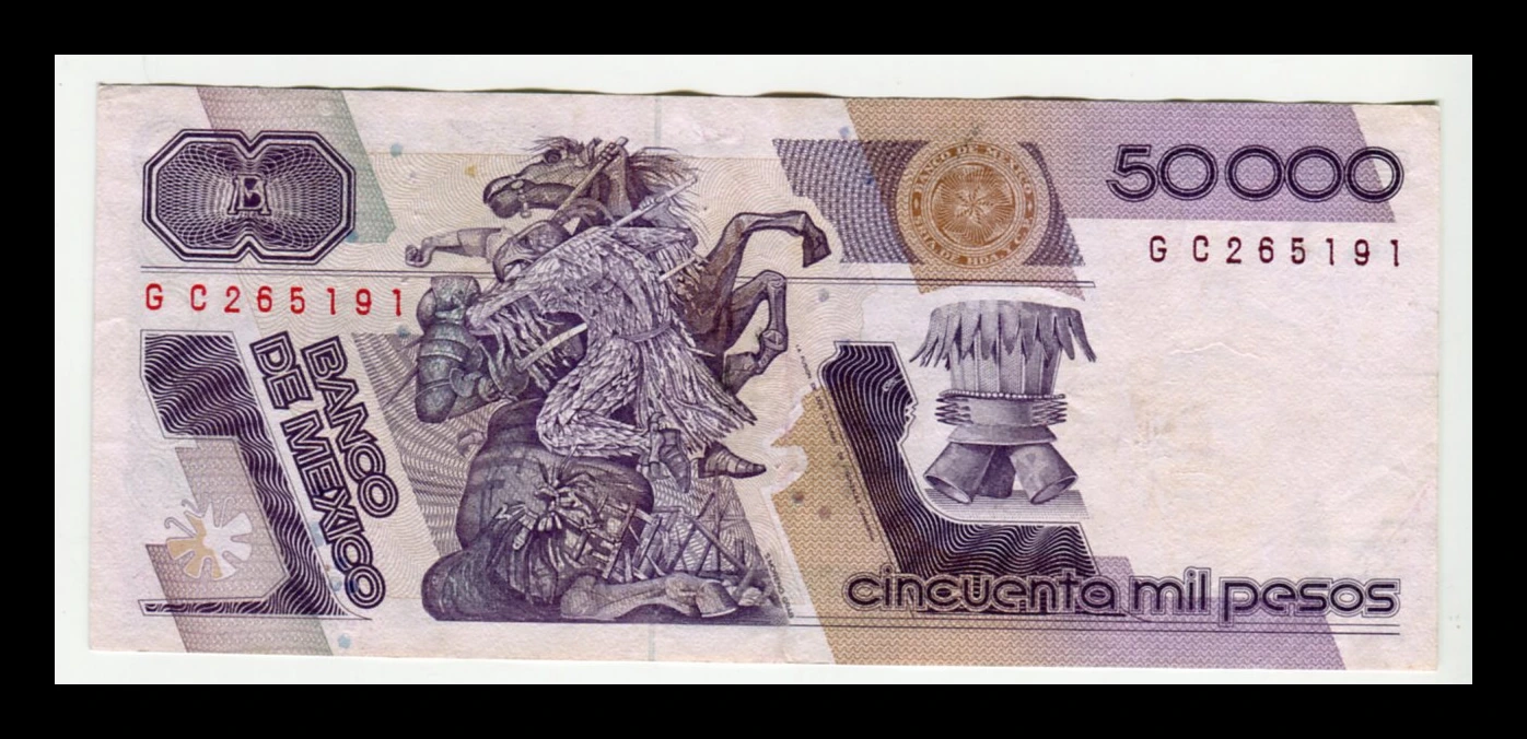 Reverso de billete mexicano de 50,000 pesos de 1988 que muestra una representación escultórica de la caída de Tenochtitlán, símbolo del fin del imperio mexica. El diseño integra elementos artísticos modernos con figuras históricas, acompañado de patrones geométricos y la denominación visible “50000”. Este billete del Banco de México destaca por su composición visual y relevancia histórica dentro de la numismática mexicana.
