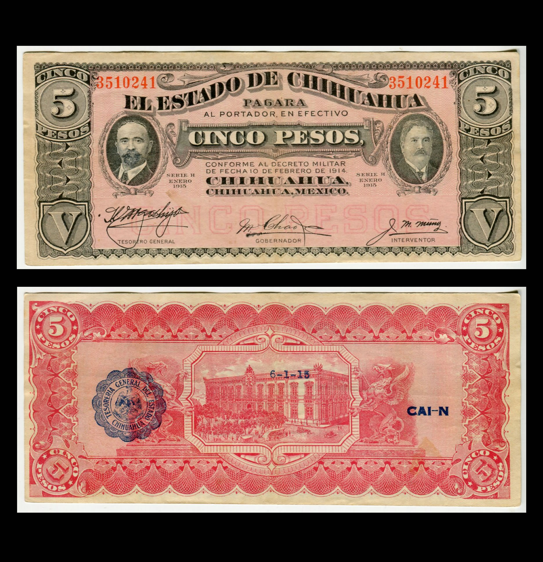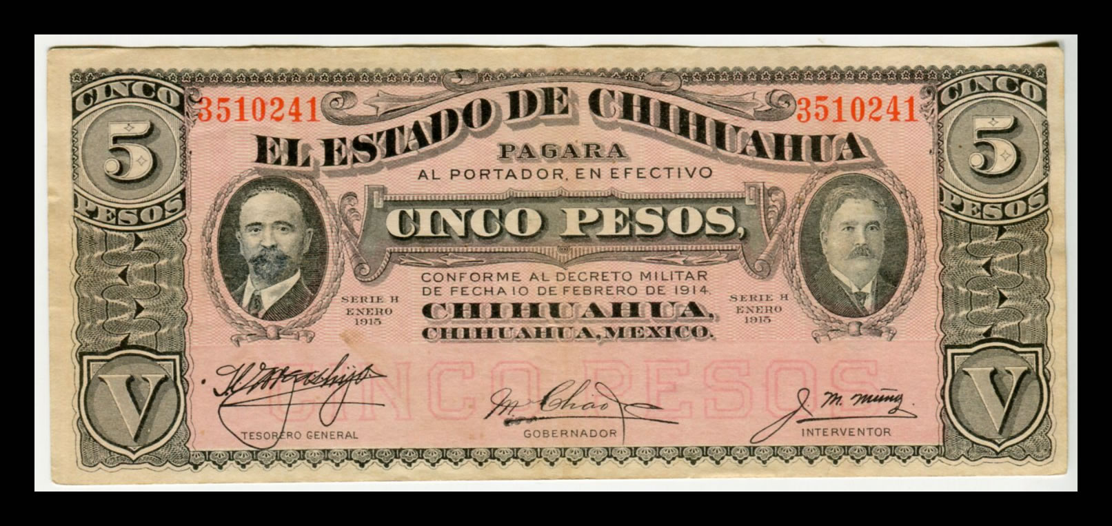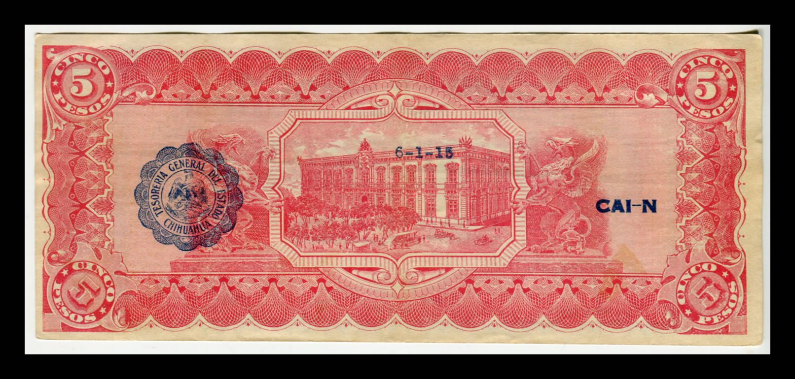 Billete 5 Pesos El estado de Chihuahua Año 1915 Condición: «F» (Fine)