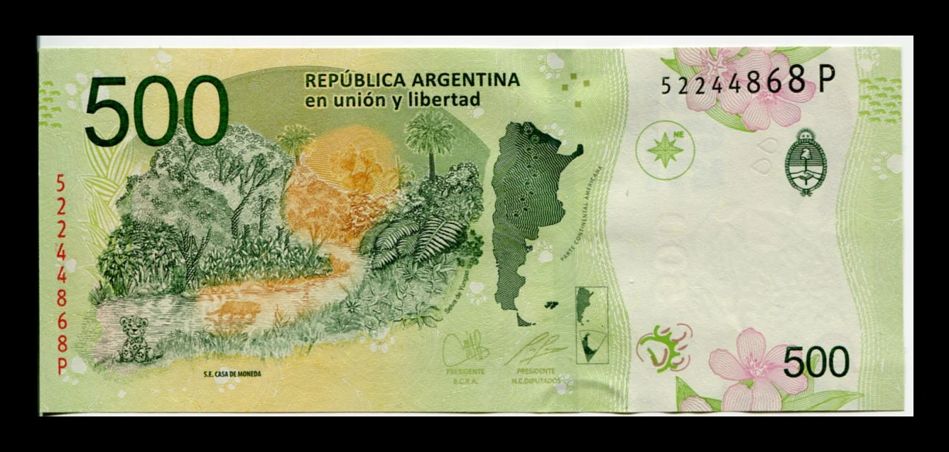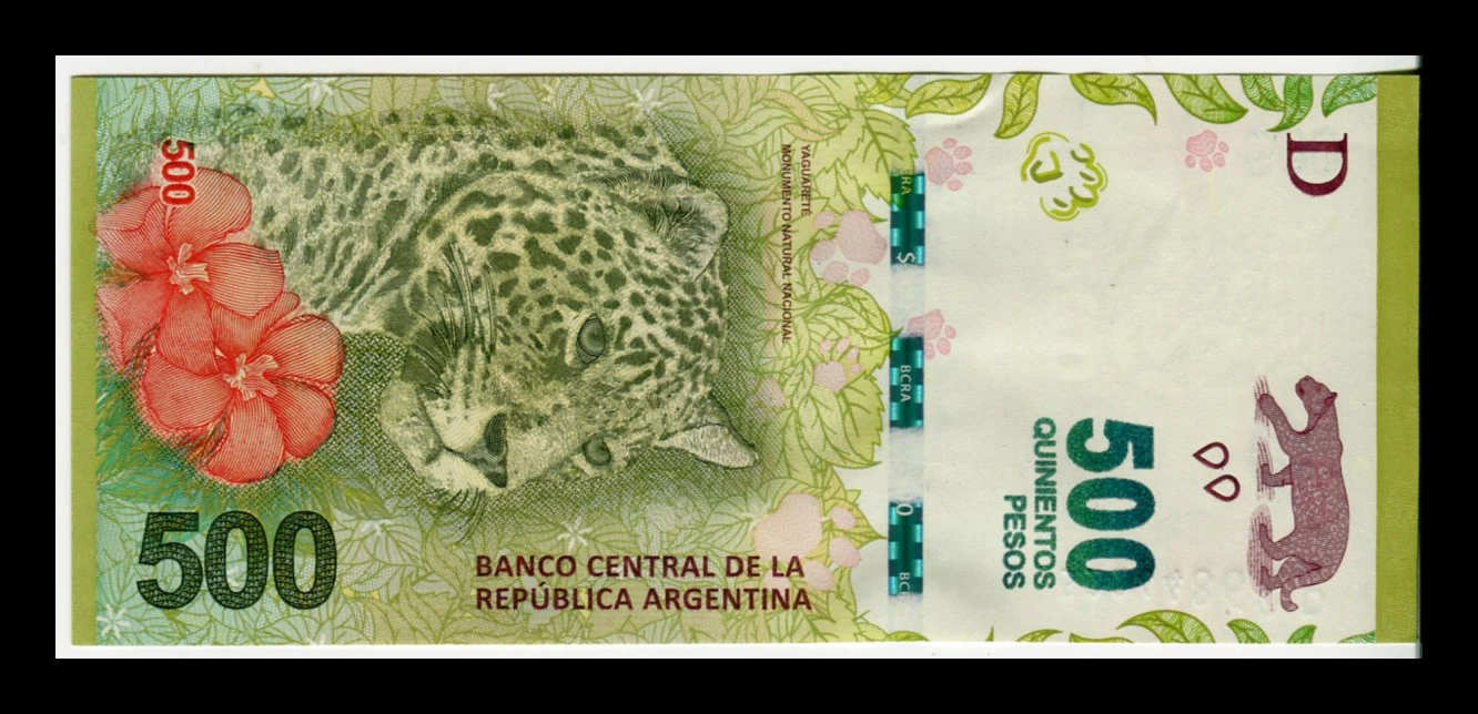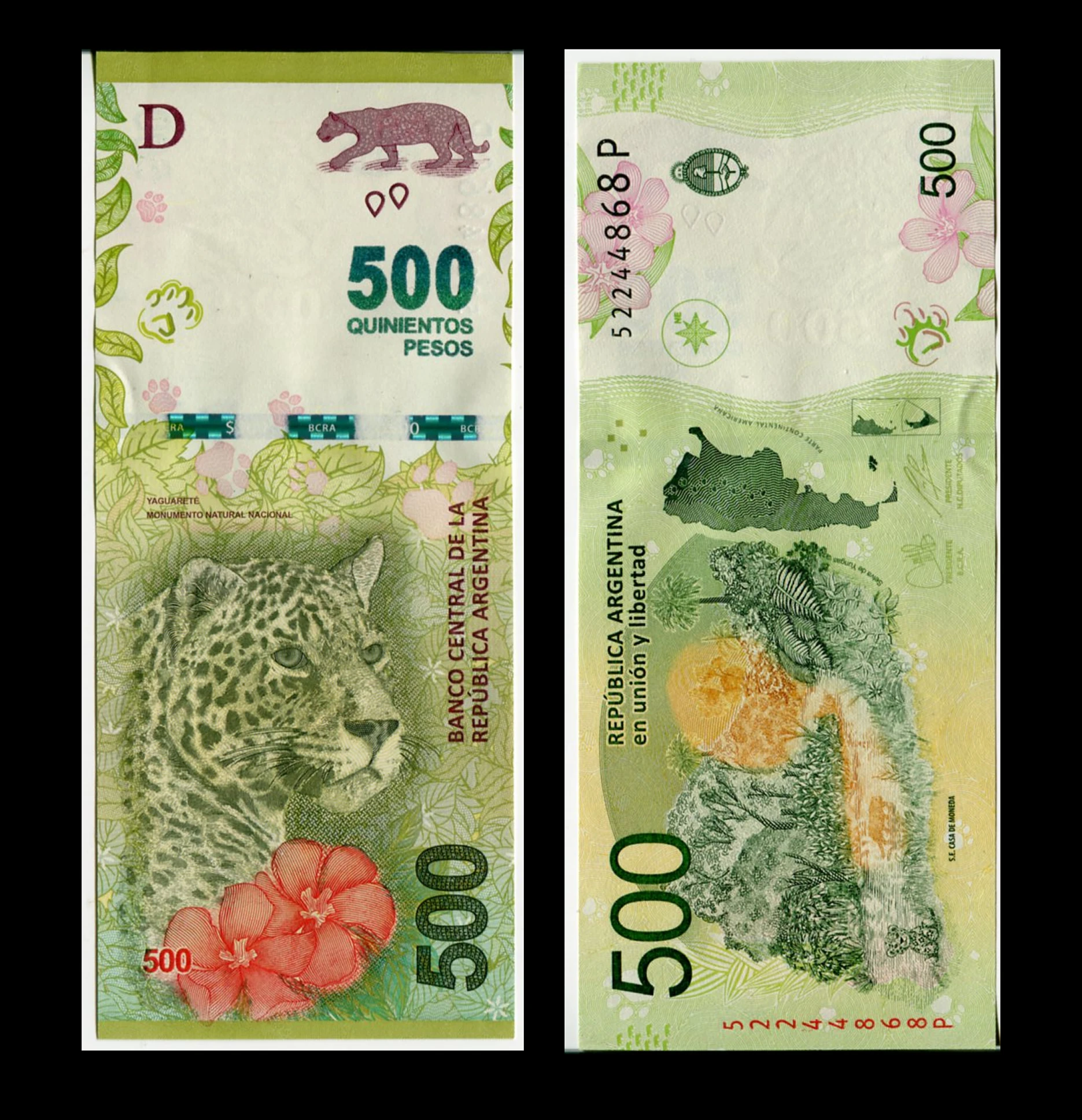 En el anverso del billete se aprecia la imagen del yaguareté (jaguar), uno de los felinos más emblemáticos de Sudamérica y símbolo de la fauna argentina. El diseño incluye detalles de vegetación y flores características de su hábitat natural, junto con la denominación 500 pesos. También se observan elementos de seguridad modernos y la inscripción Banco Central de la República Argentina.
