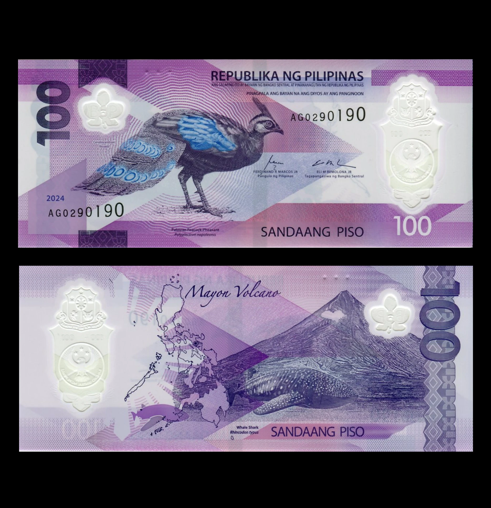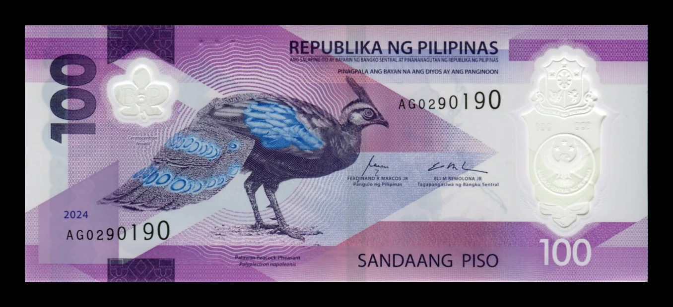 En el anverso del billete aparece ilustrado el faisán pavo de Palawan (Palawan Peacock-Pheasant), una especie emblemática de la fauna filipina. El diseño incorpora tonos púrpura y elementos de seguridad característicos del polímero, junto con la inscripción “Republika ng Pilipinas” y la denominación 100 Piso.
