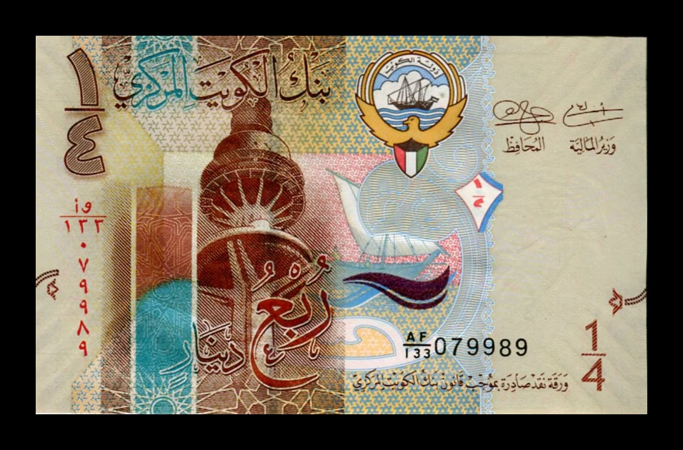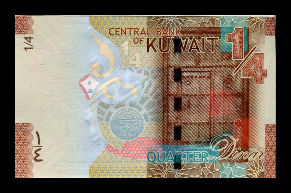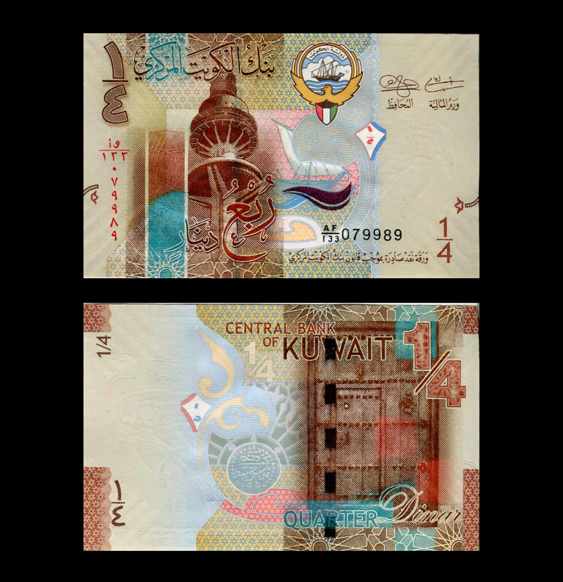 En el anverso del billete se observa el escudo nacional de Kuwait, acompañado de elaborados patrones geométricos y detalles ornamentales característicos del arte islámico. También aparece una torre de arquitectura tradicional kuwaití, símbolo del patrimonio cultural del país, junto con la denominación 1/4 Dinar escrita en árabe.