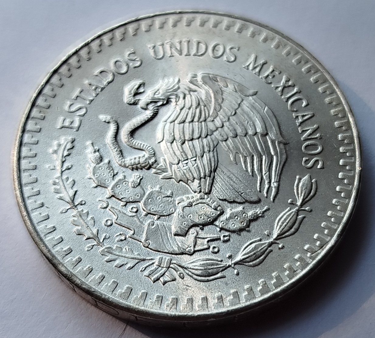 El diseño presenta a la Victoria Alada frente a los volcanes Popocatépetl e Iztaccíhuatl, símbolo de libertad y orgullo nacional, haciendo de esta moneda una de las más emblemáticas de México.