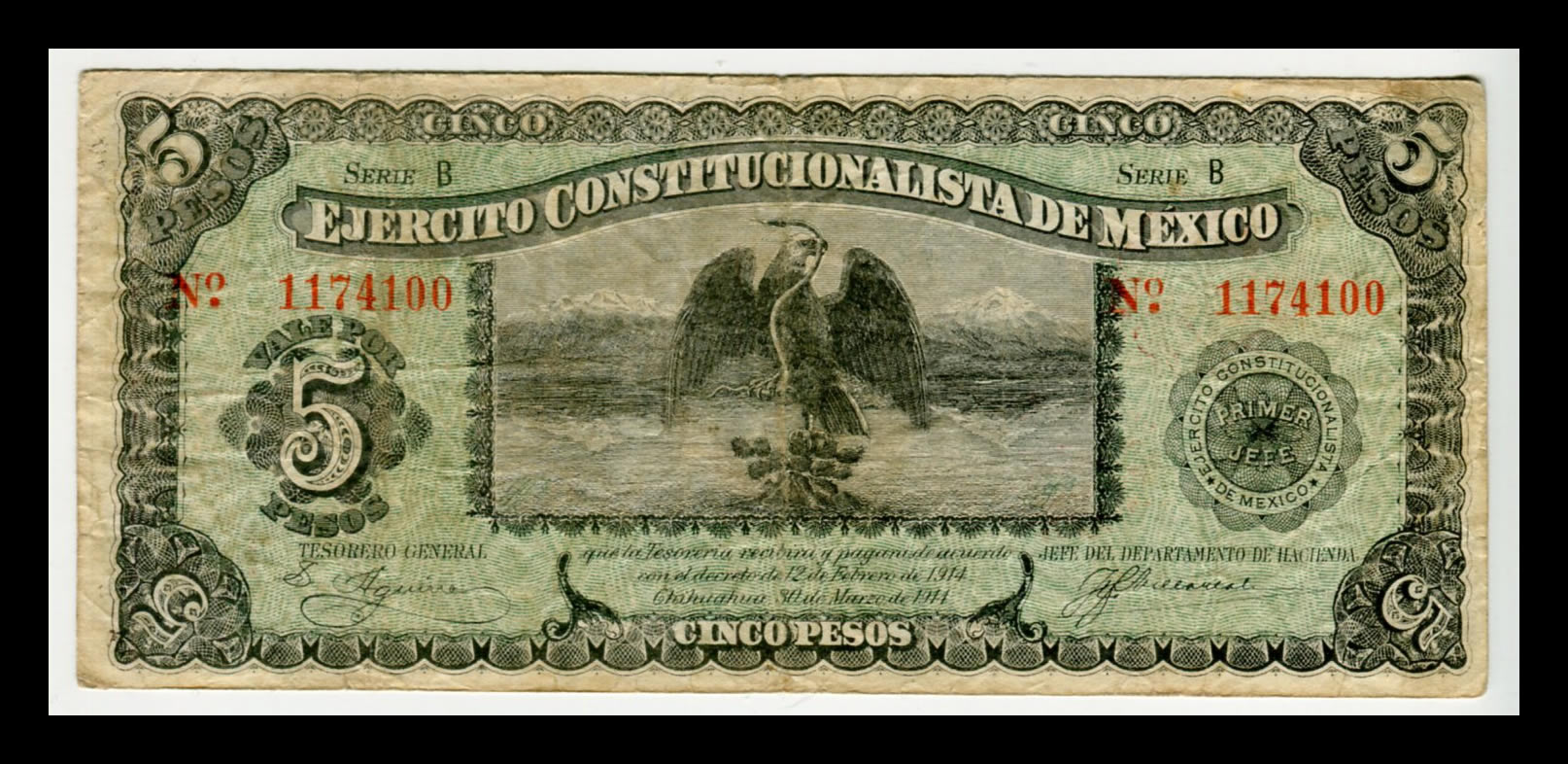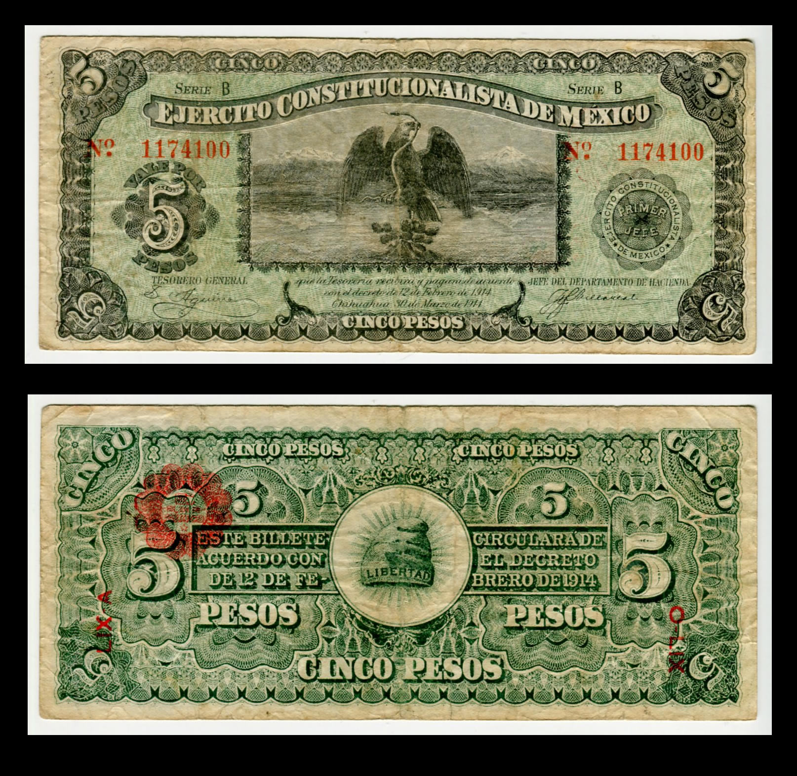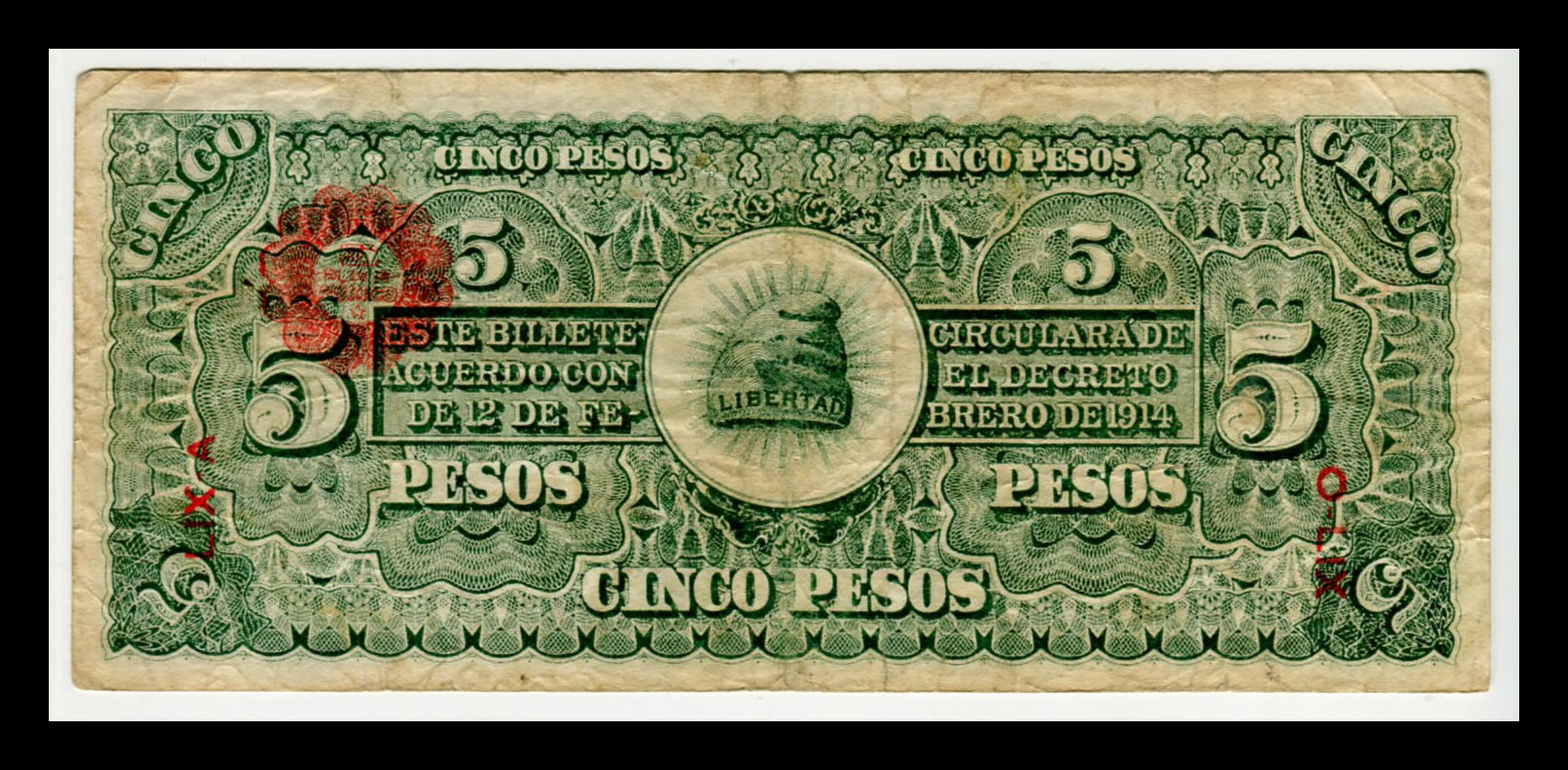 Billete Ejercito Constitucionalista 5 pesos – 1914- Condición «F» (Fine)